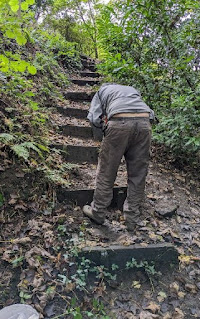 We were working so hard that we failed to get a picture of the replaced steps and of the area cleared around the footbridge! Whoops! However, this footbridge is the shorter of the two but will need handrails on both sides because of the long, long drop into a muddy stream bed!