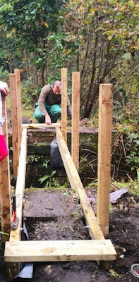 This is the shorter of the footbridges and its ends rest on good, stone abutments . . . but with a long drop down to mud and water; careful attention and a sense of balance was essential! Some minor tweaking of the original footings and a positional adjustment of two handrail posts was needed before the relatively straightforward construction could get underway.