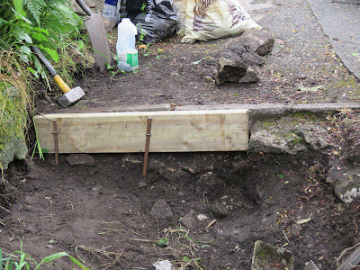 The original steps were cleared and shored-up where necessary, and one wooden step was installed. All these were pinned with rods rather than with wooden stobs so as to avoid damage to the surviving stone setts. Tread areas were in-filled with MOT which (hopefully) will bed-in and be less likely to wash away.